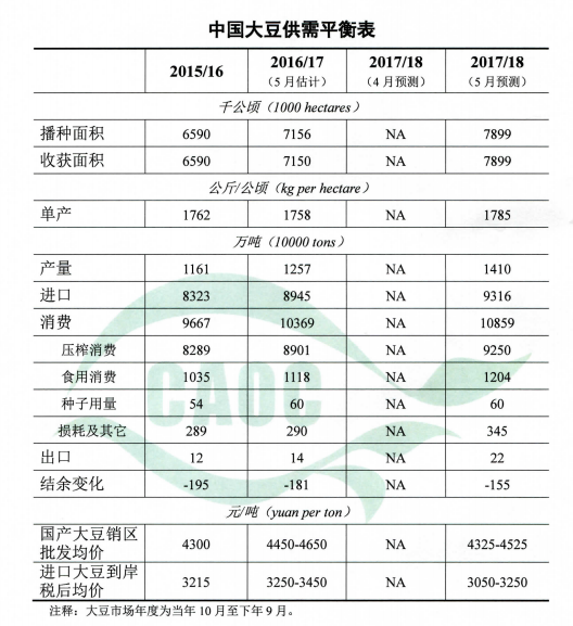 本月预测,2017/18年度,大豆播种面积7899千公顷,比上年度增加10.4%;当前东北产区土壤墒情好于往年同期,预计全国平均单产将达到常年水平,比上年度增加1.5%;大豆总产量1410万吨,比上年度增加12.2%;受生猪产能逐步恢复、豆粕对其他蛋白类产品的替代增加等因素影响,预计大豆进口量9316万吨,比上年度增加4.2%;大豆压榨量9250万吨;大豆食用消费量1204万吨,比上年度增加7.7%;损耗及其它消费量345万吨,主要受膨化大豆消费增加拉动。预计2017/18年度进口大豆到岸税后均价每吨3050-3250元,中间值较上年度下调200元,主要原因是国际大豆价格预计保持相对低位,且从2017年7月1日起我国农产品增值税税率下调;2017/18年度国内大豆产量增幅较大,加上国际市场大环境影响,预计销区大豆平均价每吨4325-4525元,中间值较上年度下调125元。