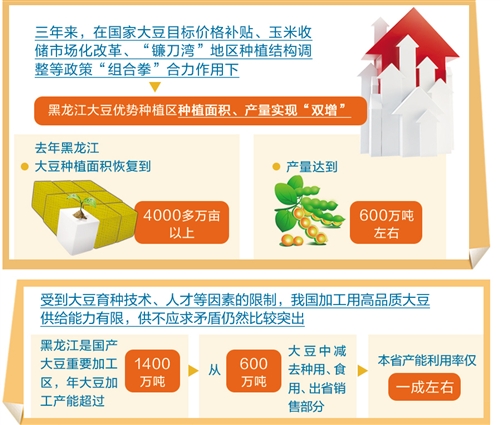 近3年来,在国家大豆目标价格补贴、玉米收储市场化改革、“镰刀湾”地区种植结构调整等政策“组合拳”合力作用下,黑龙江大豆优势种植区种植面积、产量实现“双增”,去年黑龙江大豆种植面积恢复到4000多万亩以上,产量达到600万吨左右。