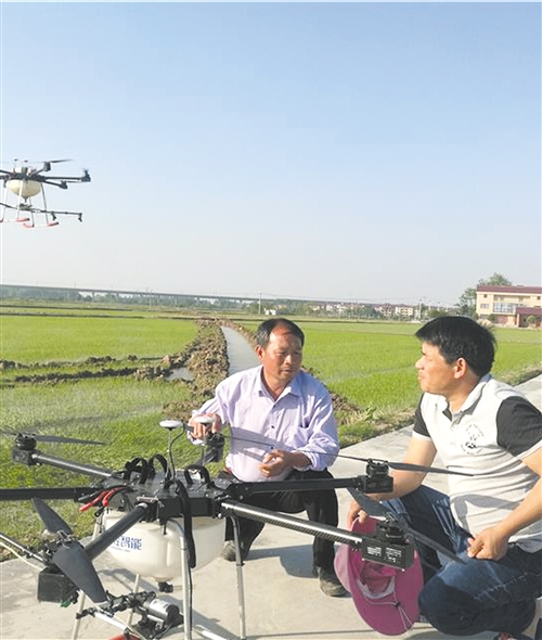 吴秋邦(左)介绍,一台无人机2分钟就能喷洒好一亩田,效率高了10倍不止。 本报记者 王轶辰 摄