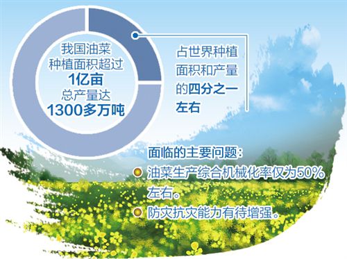 “但同时也应该看到,我国在油菜产业发展方面还存在不少困难和制约因素。”全国农业技术推广服务中心副主任许发辉认为,首先,油菜产业机械化水平有待提升,目前油菜生产综合机械化率仅为50%左右,与水稻、小麦、玉米等大宗粮食作物相比差距很大。其次,防灾抗灾能力有待增强。长江流域油菜生长后期雨水较多,田间湿度大,易造成菌核病大发生,以及根肿病发病面积不断扩大,对油菜产业影响很大。此外,油菜的种植效益和绿色加工技术及装备也需要尽快补齐短板。
