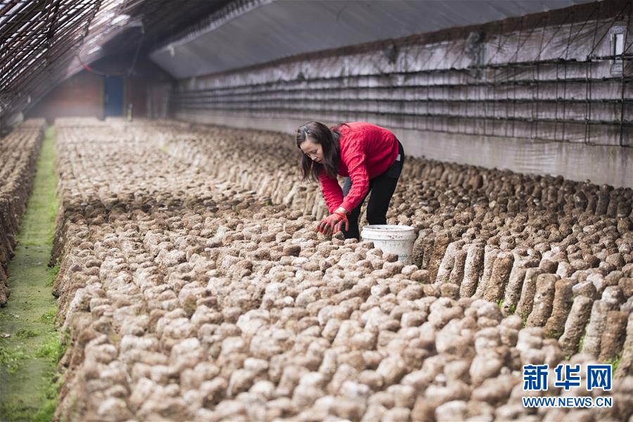 3月26日,种植户在黑龙江省红旗农场设施农业园区采摘香菇。 新华社发(张涛 摄)
