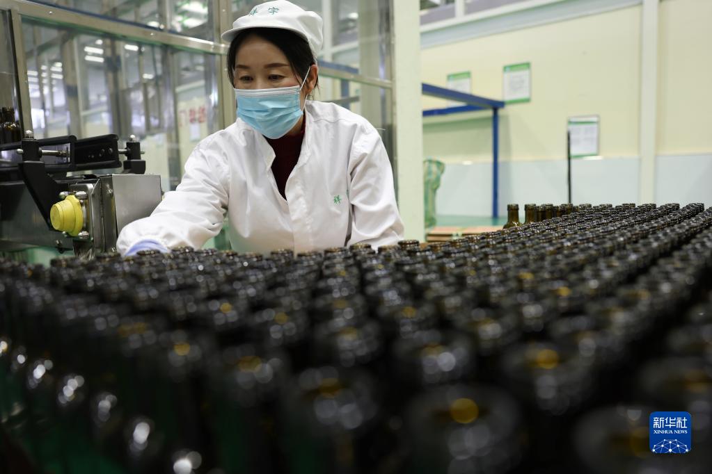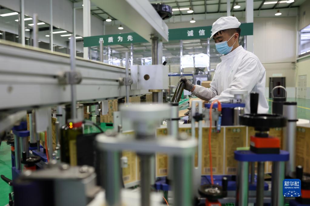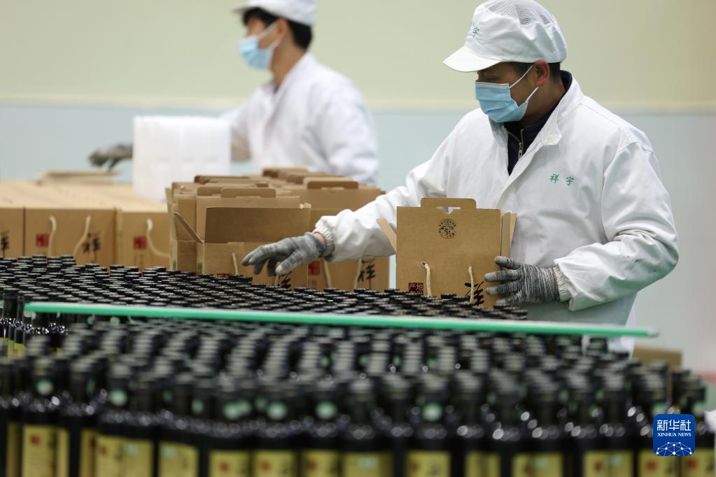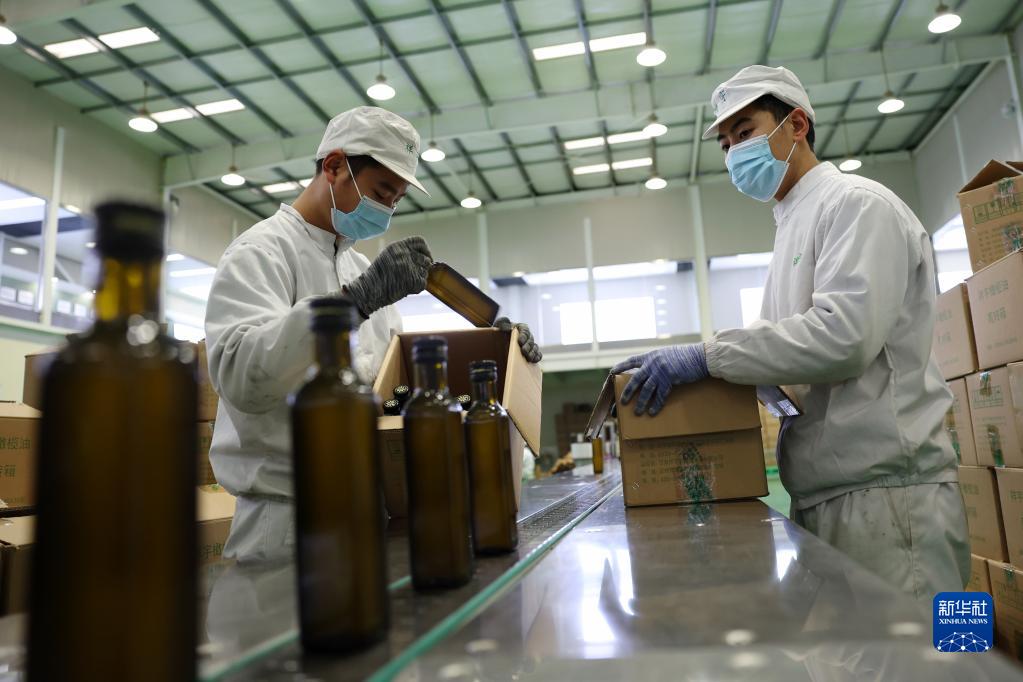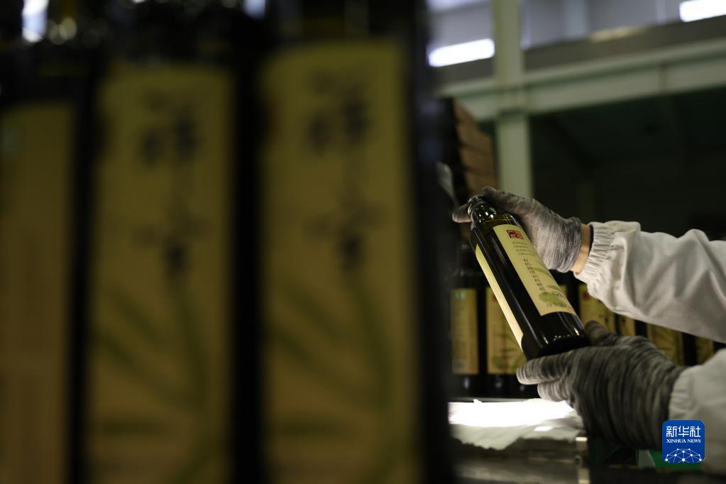 在陇南一家油橄榄加工企业的生产线上,工作人员对橄榄油进行包装(12月7日摄)。