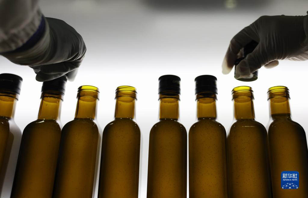 在陇南一家油橄榄加工企业的生产线上,工作人员准备给刚刚灌装的橄榄油封装瓶盖(12月7日摄)。