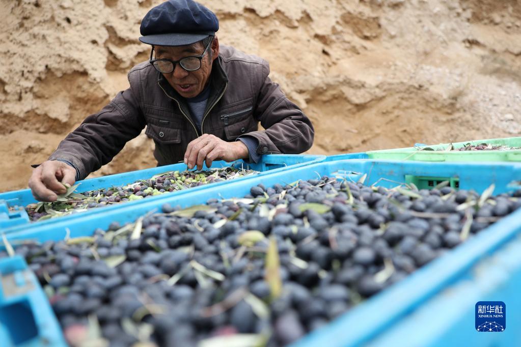 12月8日,在陇南市武都区两水镇后坝村一处油橄榄种植基地,农户在整理刚刚采摘的油橄榄。