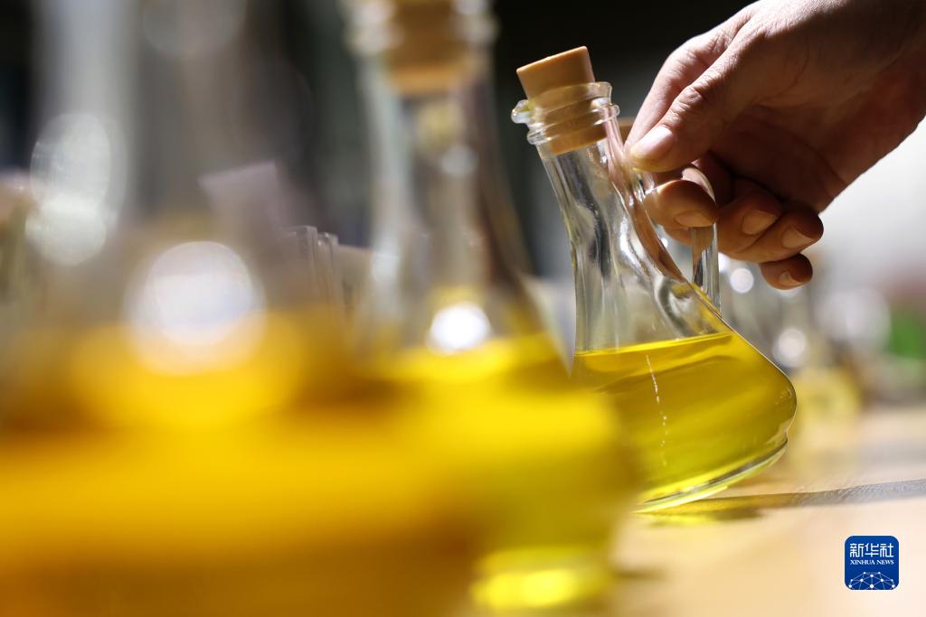 在陇南一家油橄榄加工企业的生产线上,工作人员对橄榄油进行出厂前检查(12月7日摄)。