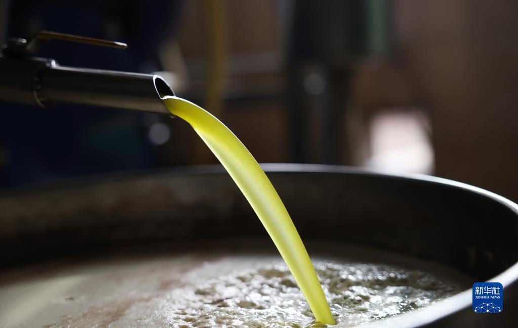 12月8日,在陇南一家油橄榄加工企业的生产线上,初榨的橄榄油准备进行沉淀处理。