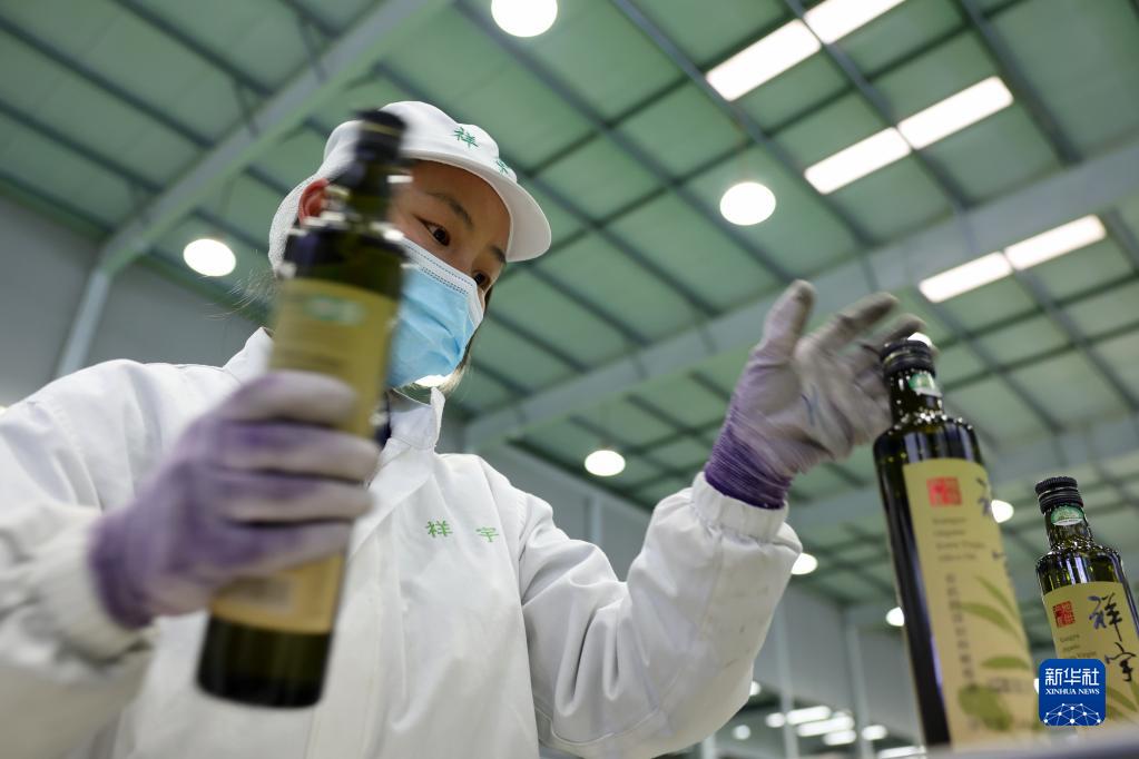 在陇南一家油橄榄加工企业的生产线上,工作人员谈花梅在查看完成灌装的橄榄油(12月7日摄)。