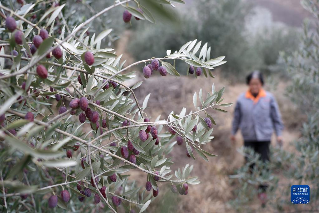 12月8日,在陇南市武都区两水镇后坝村一处油橄榄种植基地,农户准备采摘油橄榄。