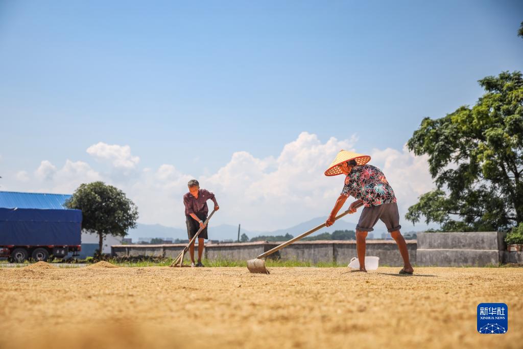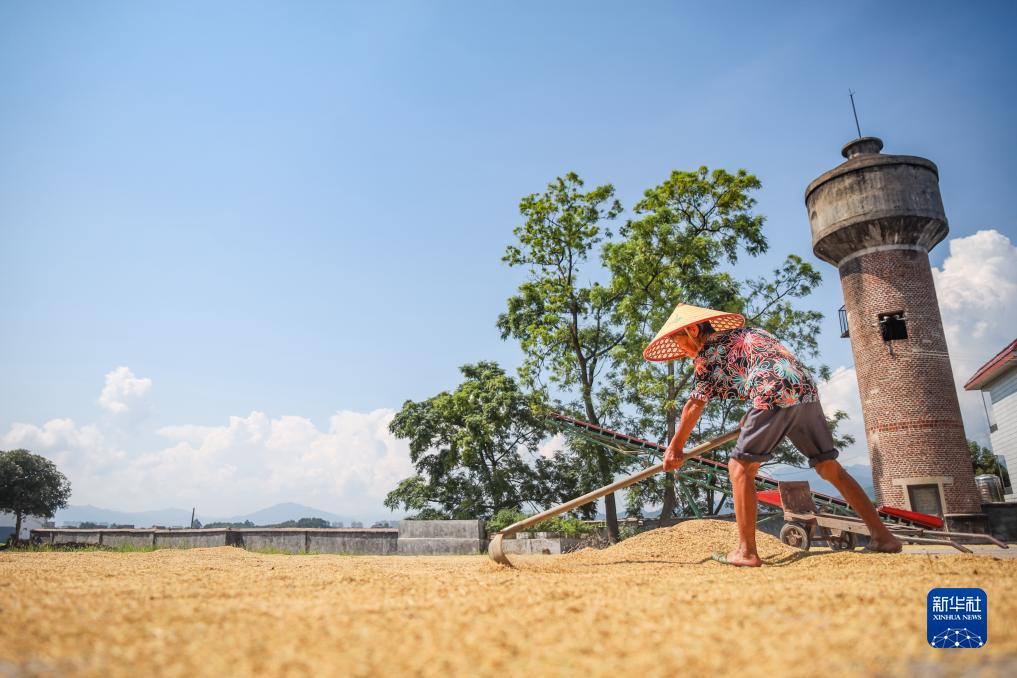 时刻新闻 —分享— 7月26日,湖南省永州市蓝山县塔峰镇成家村村民在晾晒稻谷。夏收时节,湖南省永州市蓝山县早稻喜获丰收,农民趁着晴好天气忙着收割、晾晒,一派丰收景象。新华社发(彭华摄) 来源:新华网 编辑:李偲