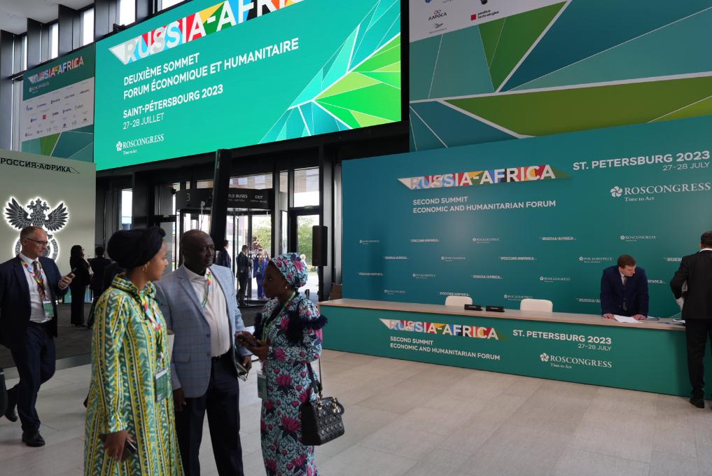 7月27日,在俄罗斯圣彼得堡,俄非峰会与会人员在会场交流。第二届俄罗斯-非洲峰会暨经济和人道主义论坛当日在俄罗斯圣彼得堡开幕。俄罗斯总统普京发表讲话说,俄方近期将向部分非洲国家免费供应粮食。(新华社记者安晓萌摄)