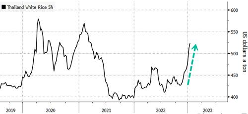 自去年 11 月以来,作为亚洲大米基准的泰国大米价格已累计上涨了 23%,最新升至了每吨 523 美元,为 2021 年 3 月以来的最高水平。