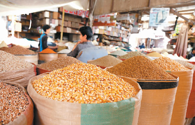 图为也门萨那集市上出售的粮食。穆罕默德·穆罕默德摄(新华社发)