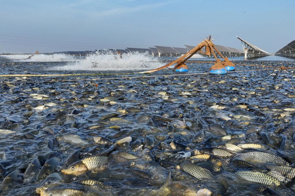 这是河北省唐山市丰南区黑沿子镇“渔光一体”现代渔业产业园鱼塘内场景(无人机照片)。新华社记者 杨世尧 摄