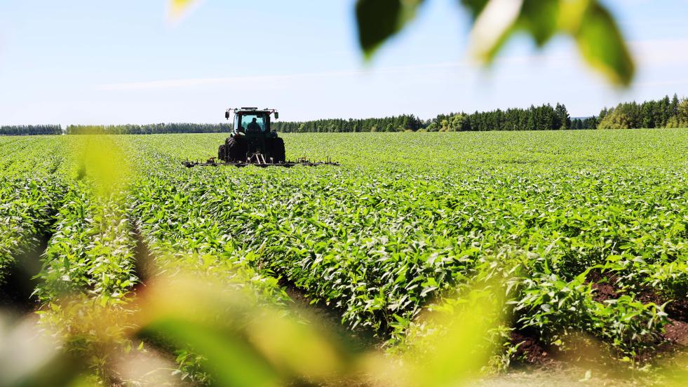 在北大荒集团黑龙江红星农场第一管理区有机大豆田里,搭载北斗导航系统的大马力机车开展有机大豆二次中耕作业(2025年7月7日摄)。新华社发(侯越摄)