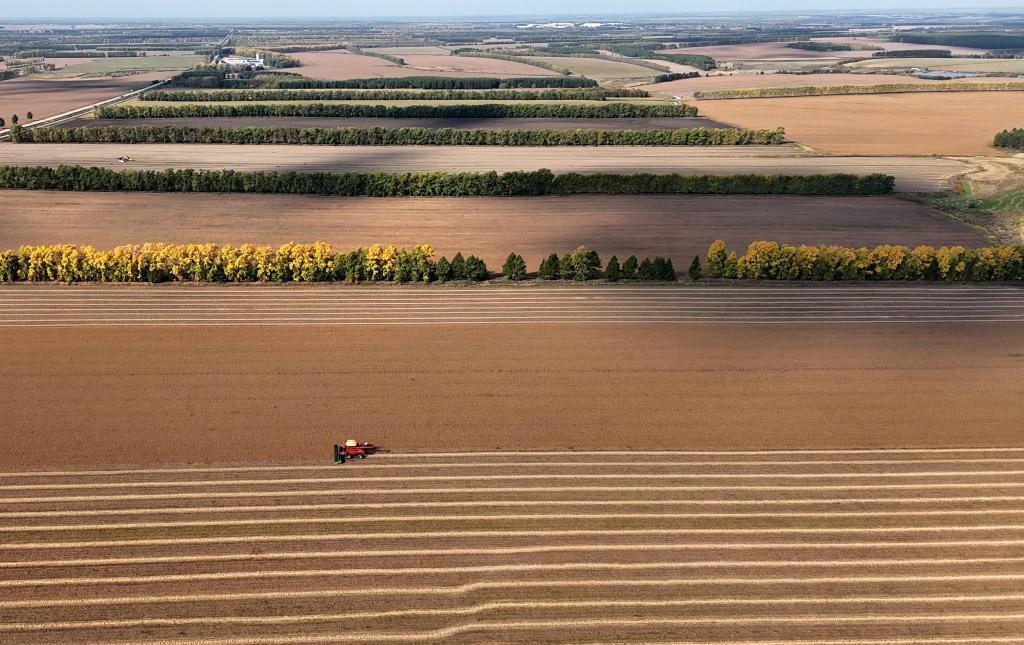 9月23日,在北大荒集团黑龙江格球山农场有限公司大豆地块,农机在进行收获作业(无人机照片)。新华社发(陆文祥摄)