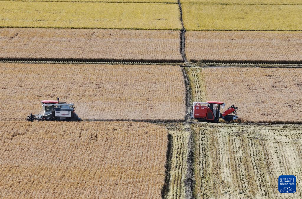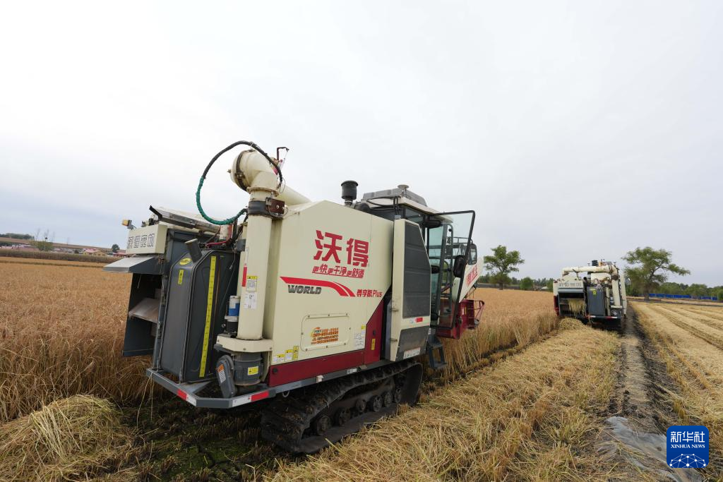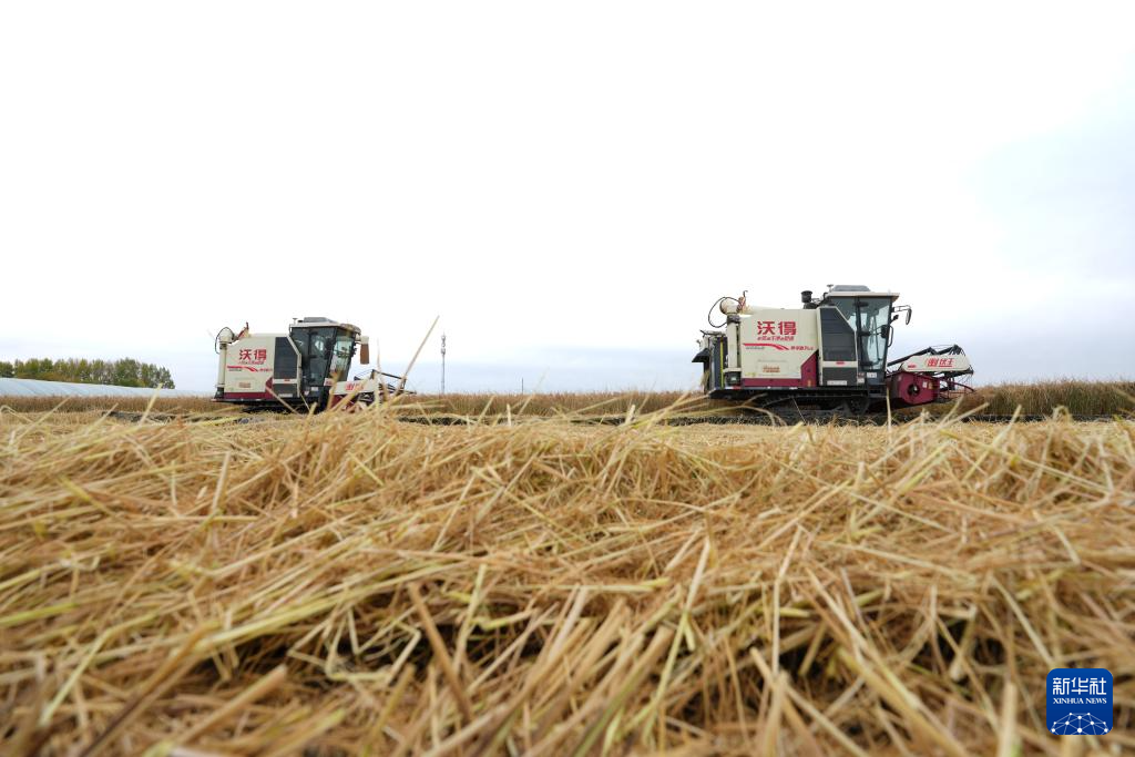10月11日,在位于黑龙江省哈尔滨市的北大荒集团闫家岗农场有限公司,机械设备在进行水稻收获作业。