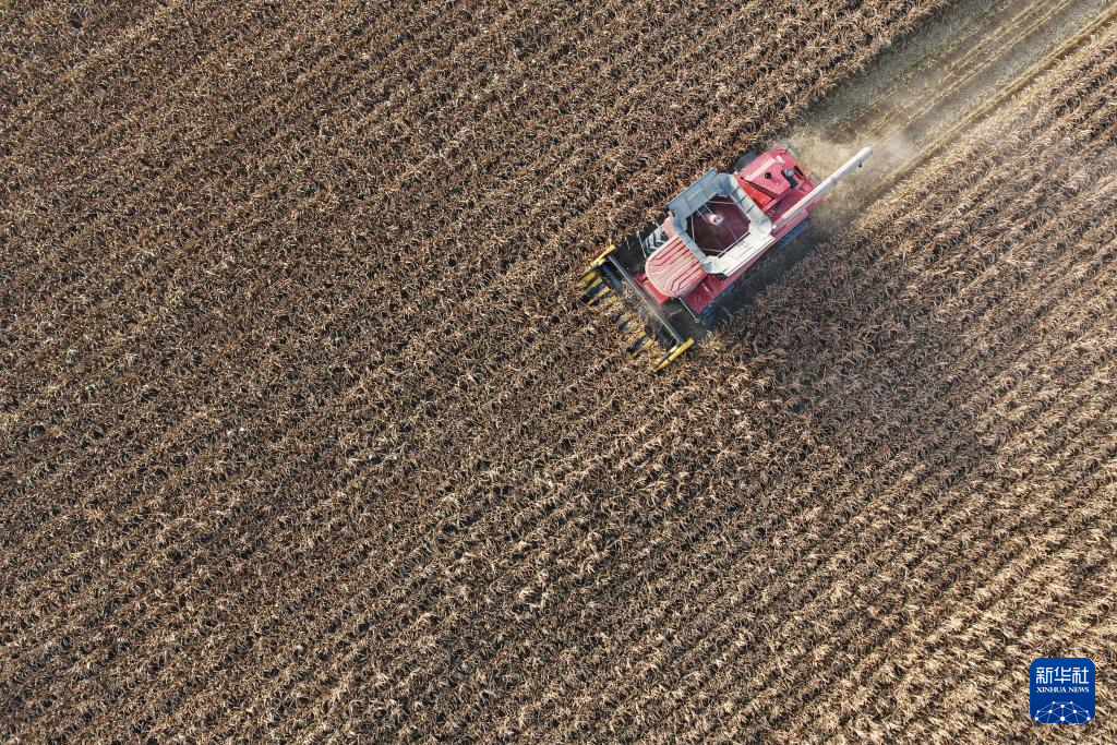 10月11日,在位于黑龙江省肇东市的北大荒集团四方山农场有限公司,机械设备在进行玉米收获作业(无人机照片)。