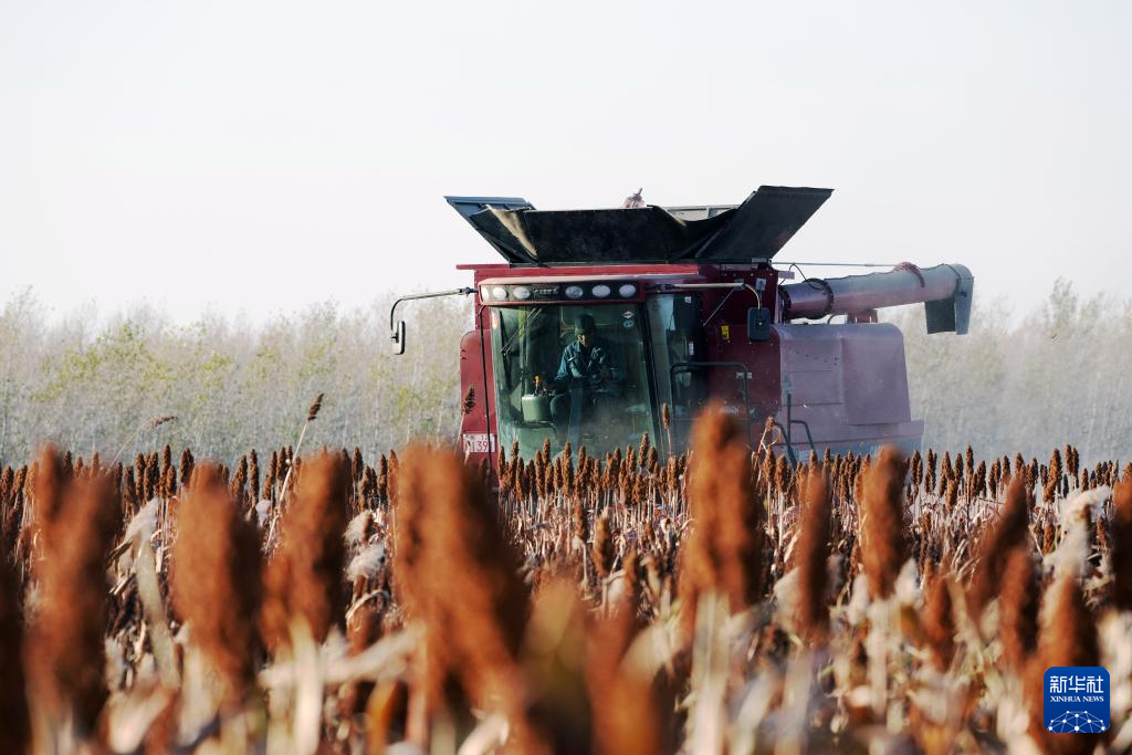10月11日,在位于黑龙江省肇东市的北大荒集团四方山农场有限公司,机械设备在进行高粱收获作业。