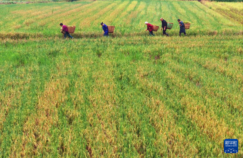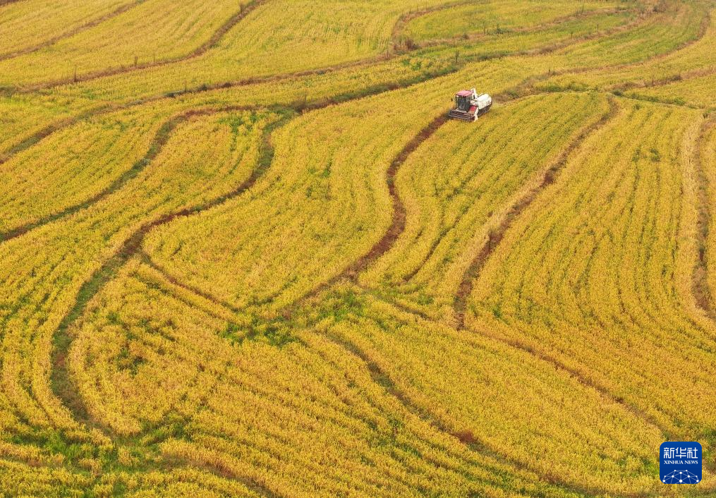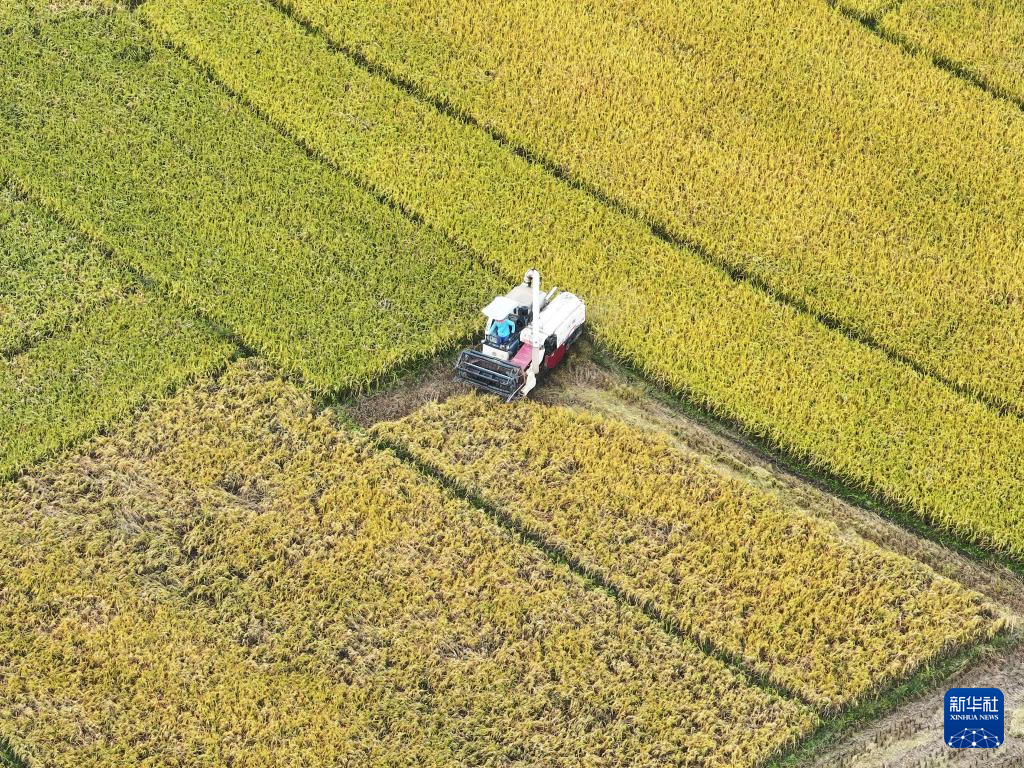 10月28日,湖南省衡阳市衡山县白果镇村民驾驶农机收割稻谷(无人机照片)。