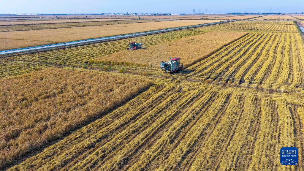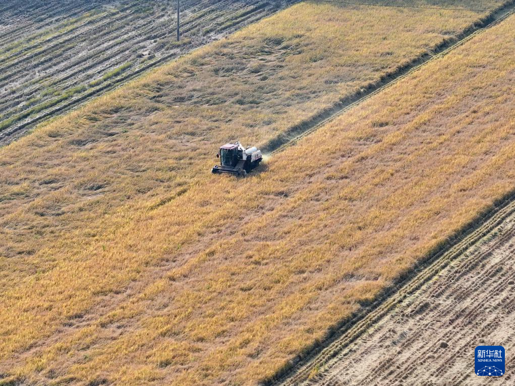 10月27日,河北省唐山市海港经济开发区王滩镇农民驾驶农机在收获水稻(无人机照片)。