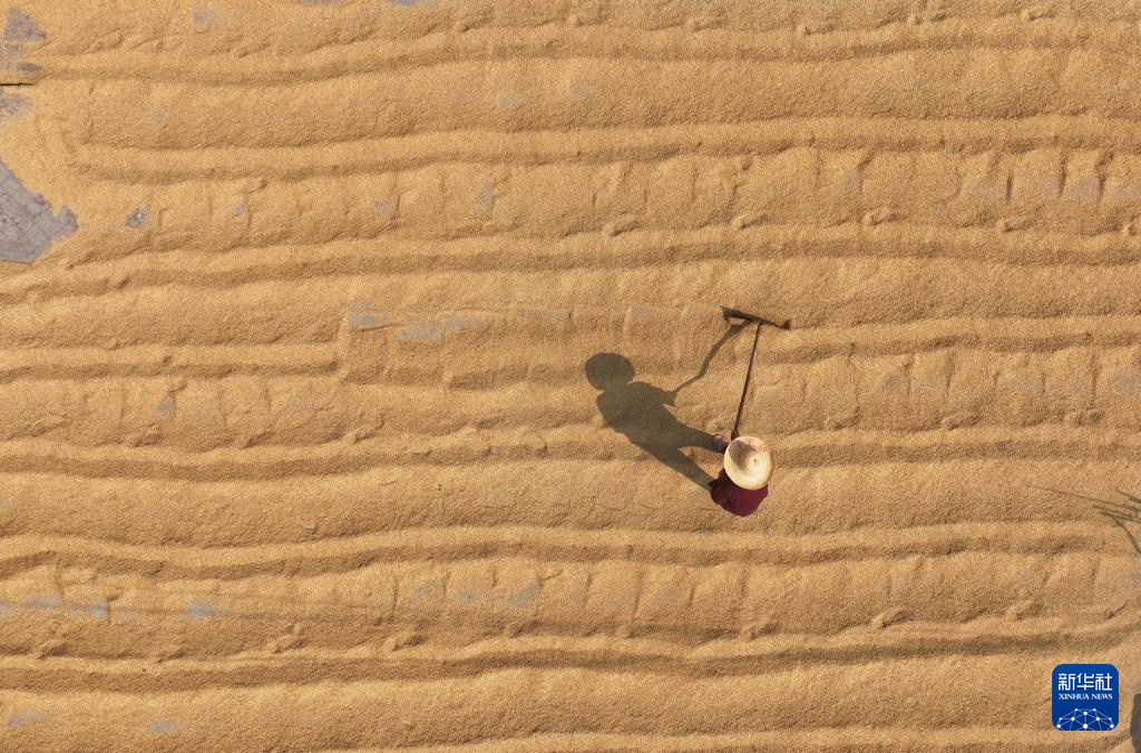 10月28日,在湖南省衡阳市衡山县白果镇,当地村民晾晒稻谷(无人机照片)。