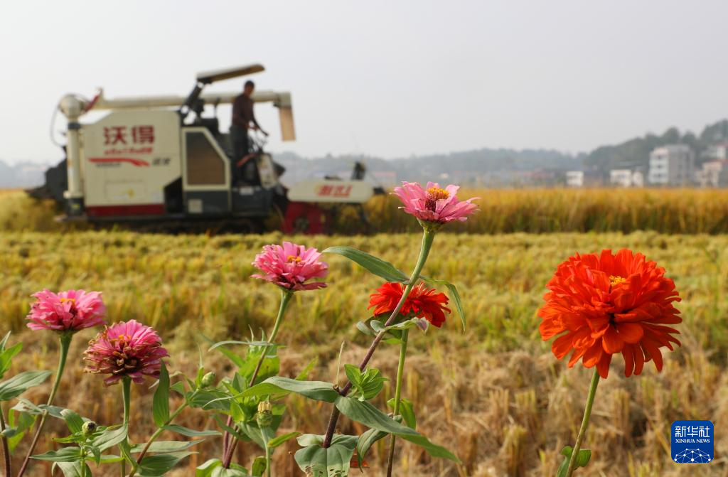 10月28日,湖南省衡阳市衡山县白果镇村民驾驶农机收割稻谷。