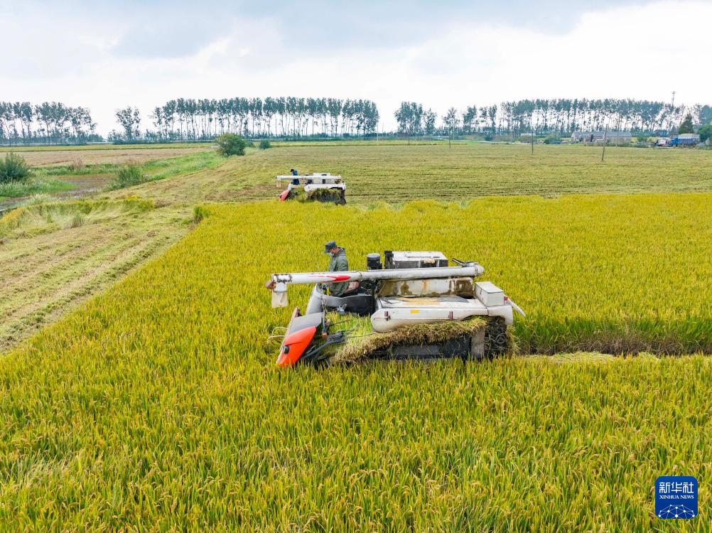 10月28日,在江苏省连云港市赣榆区沙河镇大站村,种植户驾驶收割机抢收水稻(无人机照片)。