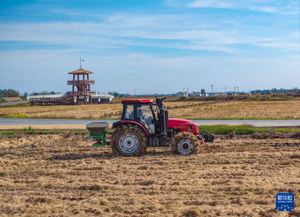 11月3日,农民驾驶农机在江苏省兴化市兴东镇周韩村田间施肥,为冬小麦播种做准备(无人机照片)。新华社发(周社根 摄)